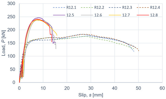 The load–slip curves from the push-out tests of the shear connections with 12 mm screws and with toothed-plate connectors (type C11-50/M12, Geka) in specimens 12.5–12.8 or without toothed-plate connectors in specimens R12.1-R12.4.