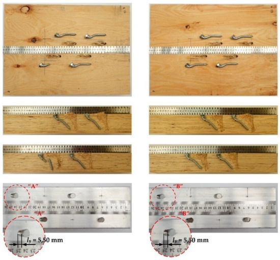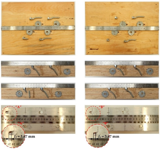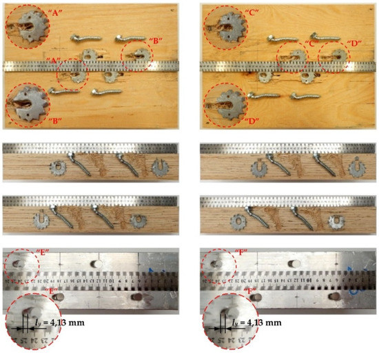 The tested screwed connections with or without Bulldog toothed-plate connectors (C2-50/M10G, C2-50/M12G) showed one distinctive mode of failure presented in Figure 10, Figure 11, Figure 12 and Figure 13. The authors observed the formation of two plastic hinges within the screw, the crushing of LVL, hole ovalisation in the flange of the aluminium alloy beam, and hole ovalisation in the toothed plate or its tearing. In the specimens where the teeth were strongly connected with the LVL and did not allow for the movement of the toothed plates, the toothed plates were torn (see Figure 11). Some of the screws were sheared near the end of the tests. In Figure 10, Figure 11, Figure 12, Figure 13 and Figure 14, the symbol ly was used to present the mean length of the yielded zone in the aluminium flange (measured at the end of the tests). The yielded zone was caused by the bearing of the screw to the hole wall.