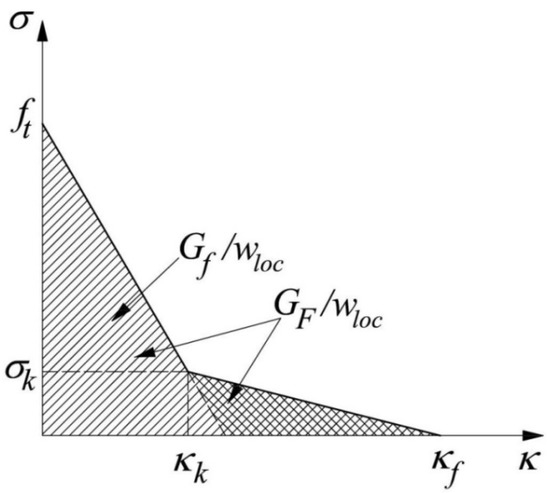 where σi, i = 1, 2, 3 are the principal stresses, σt is the tensile yield stress and κ is the softening parameter equal to the maximum principal plastic strain ε1p [11]. The associated flow rule was assumed. The bilinear function recommended by Hoover and Bazant [15] (Figure 1) was used to describe the post-peak softening under tension. The total fracture energy GF = 80 N/m was calculated after the CEB-FIP code [16], based on the experimentally measured concrete compressive strength fc = 30 MPa and the maximum aggregate diameter da = 20 mm. The ratio between the total and initial fracture energy was taken to be GF/Gf = 1.5 (very close to recommendation in [15]). The uniaxial tensile strength ft was not experimentally measured by Koide et al. [7,8]. Nevertheless, ft = 2.9 MPa was initially adopted (estimated based on fc and the recommendations in Eurocode 2 [17]).