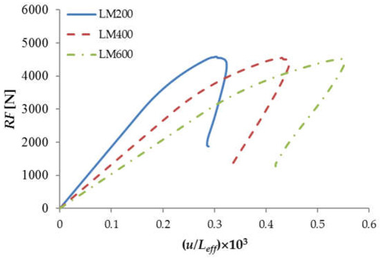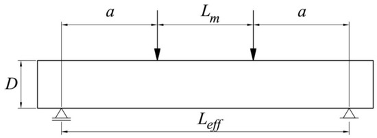 Three beam sizes of a constant depth D = 100 mm and thickness t = 100 mm but varying span were analyzed, similar to Series C as tested by Koide et al. [7,8]. The beams were subjected to four-point bending, and the distance from the support to the loading point was always a = 200 mm (Figure 3). Hence, the energetic size effect was negligible, and the predominant statistical size effect could be investigated. The beam’s effective span Leff varied from 600 mm through 800 mm and up to 1000 mm, while the corresponding distance between loading points was Lm = 200, 400 and 600 mm (beams denoted as LM200, LM400 and LM600, respectively). Series C, as tested by Koide et al. [7,8], consisted of 121 plain concrete beams, including 46, 40 and 35 identical specimens of sizes LM200, LM400 and LM600, respectively.