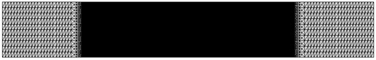 A large central part of the beam, where the non-local elasto-plastic material was defined, was covered by a fine FE mesh consisting of right triangles of dimensions 1 mm × 1.25 mm (Figure 4). The remaining part of the beam, which consisted of a coarse mesh, was defined as an elastic material. Analysis was performed under plain stress conditions. The initial calculations started with the following concrete properties: uniaxial tensile strength ft = 2.9 MPa, initial fracture energy Gf = 52 N/m, total fracture energy GF = 80 N/m, elasticity modulus Emod = 30 GPa and Poisson’s ratio ν = 0.17. The nominal strength of a beam expressed as σN = Mmax/(tD2/6) was linearly dependent on Mmax due to the constant cross-section dimensions. Hence, the terms nominal strength and bending moment were used interchangeably when describing the results.