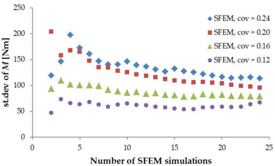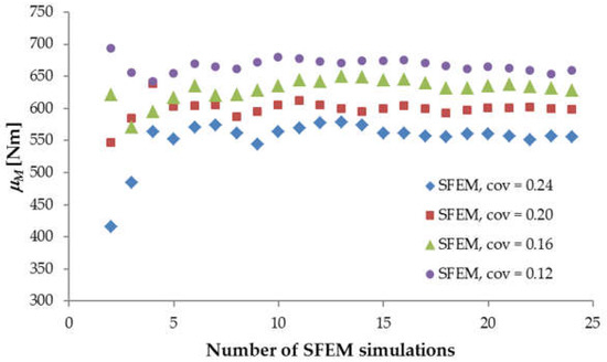 Initially, 2000 random fields were generated for each beam size and each material parameter. In order to reduce the computational time, the stratified sampling technique [11] was applied, and as a result, 24 random fields were eventually chosen for further FE simulations. Stochastic analysis started with the shortest beam, denoted as LM200 with simultaneously varying ft, Gf and Emod, for which a strong cross-correlation was assumed to be r = 0.9. The material coefficients of variation (identical for ft, Gf and Emod) changed from cov = 0.12 through 0.16 and 0.20 and up to 0.24 (for each cov, the new set of random fields was generated). First, convergence analysis was performed in order to verify whether the specified number of SFEM simulations provided a satisfactory approximation of the desired solution. Figure 5 compares the calculated mean values of the ultimate bending moment obtained for an increasing number of SFEM simulations with different material cov values. Initially, when the number of simulations was under five, the scattering of the mean value μM was very strong, particularly for a higher material cov. After 10 simulations, the fluctuation of μM weakened, and after ca. 20 simulations, the changes were unnoticeable for all material cov values. Referring to the standard deviation of ultimate M (Figure 6), its convergence was slightly slower than that observed for the mean value, although after 20 simulations, the obtained standard deviations showed acceptably low changes. Thus, the chosen number of 24 simulations turned out to give adequate results.