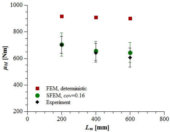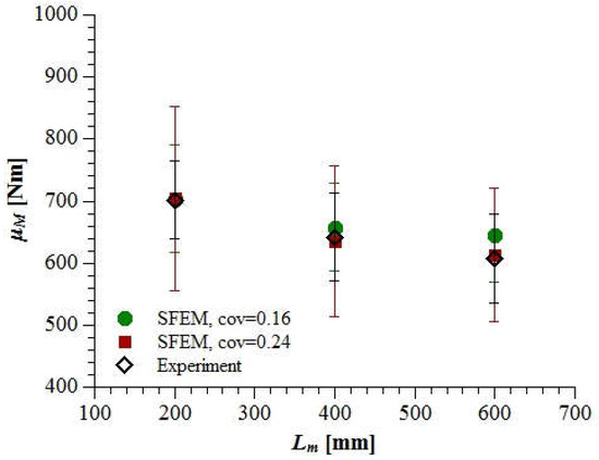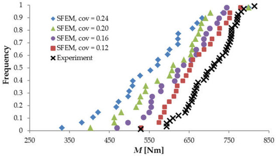 This time, the agreement between the laboratory measured and simulated mean ultimate bending moments for cov = 0.24 was nearly perfect (Figure 12). However, the scattering of results in the case of SFEM analysis with cov = 0.24 was significantly stronger than in the experiments. This may indicate the need to introduce the grafted Gaussian–Weibull probability distribution function for the concrete material properties in order to better reflect both the mean and the standard deviation of the results.