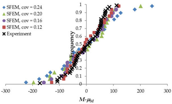 Figure 7 compares the experimental and numerical frequency diagrams obtained for beam LM200 with various material cov values. The calculated mean ultimate bending moment μM reached 659, 627, 598 and 555 Nm for material cov values of 0.12, 0.16, 0.20 and 0.24, respectively, while the corresponding standard deviation of M was 67, 78, 95 and 113 Nm. It is clear that the calculated mean ultimate bending moment did not coincide with the experimental one. However, the effect of the varying material cov upon the resulting variation of M could be still verified against the experimental outcomes based on the translated frequency distributions (Figure 8) (translated by the calculated mean value μM for each distribution separately). The experimental frequency distribution was subdivided into 24 strata (the same number as in the SFEM calculations), keeping the extreme values unchanged. Next, for each stratum, the average value was estimated. The calculated mean square error between the numerical and experimental translated distributions indicated the material cov = 0.16 gave the best agreement.