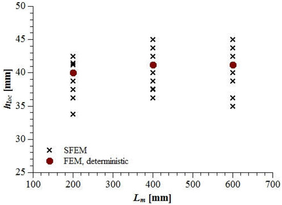 Measured localized zone height at the peak load from deterministic and stochastic FEM simulations with cov = 0.16.