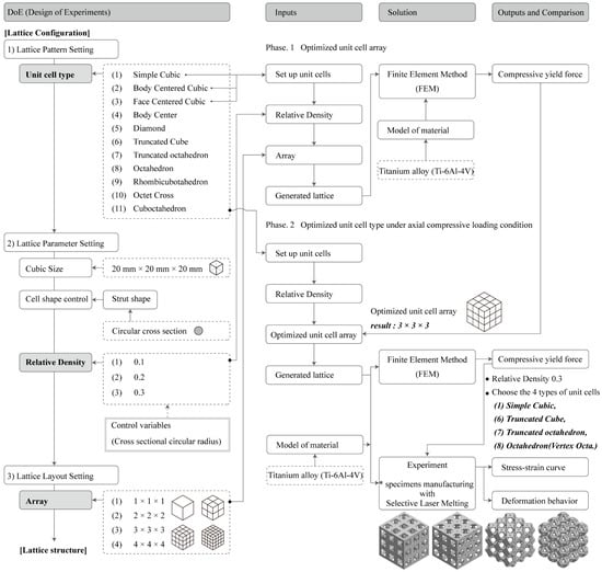 Consequently, understanding the material topology–property relationship, which presents the mechanical properties as a function of the relative density and topology of lattices, is a precondition to allowing a product design that provides improved properties. Therefore, it is necessary to optimize the lattice structure configuration, unit cell array, and unit cell type under axial compressive loading conditions and perform finite element analysis (FEA) and experimental tests on metallic specimens generated by SLM. Therefore, in this study, we addressed the aforementioned issues by implementing the following processes, as shown in Figure 2.