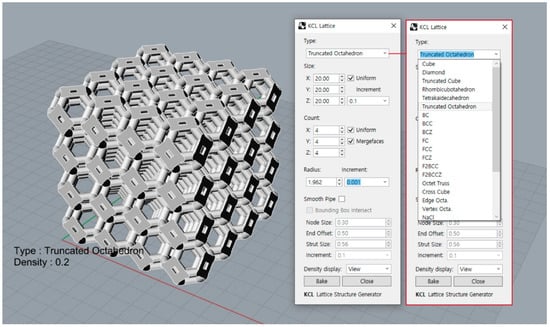 To automate the process, we developed a lattice structure generator plugin for Rhinoceros (Rhino 7, Robert McNeel & Associates, Seattle, WA, USA). This plugin has various unit cell topologies, and it can adjust the lattice structure boundary size, unit cell arrangement, and strut radius of the unit cell (Figure 4).