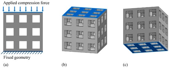 Boundary conditions: (a) frontal view with boundary conditions; (b) prospective view with applied compression force on top surface; (c) prospective view with fixed bottom surface.