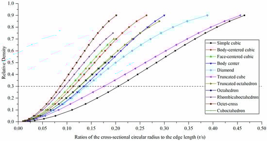 The relative densities and values of the 11 types of unit cells (relative density in the range of 0.005–0.900) are shown in Table 3 and Figure 6. By setting as a variable, it was possible to control the relative densities of the unit cells. For unit cells with the same relative density, the of the simple cubic was the largest. At a relative density of 0.3, simple cubic had the highest value, and octet-cross had the lowest value, at 0.206 and 0.087, respectively. It was impossible to formulate a design with high values for the unit cell types of cuboctahedron, face-centered cubic, rhombicuboctahedron, and octet-cross. This was due to a Boolean operation error, whereby an increment in the value resulted in an increase in the volume of the members (node and strut), thereby creating additional intersections between the adjacent members and too many overlapping members.