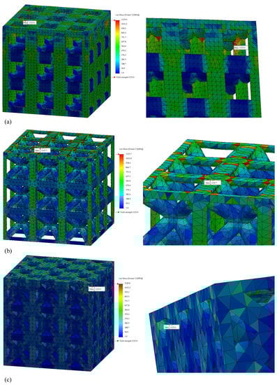 Stress distribution of the lattice structures (relative density of 0.3; 3 × 3 × 3 pattern): (a) Octahedron; (b) truncated cube; (c) truncated octahedron.