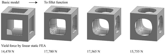 In addition, we performed preliminary experiments to improve the design of simple cubic systems by changing the fillet function (Figure 9). While using the same material, dimensions and relative density, the preliminary results showed that the topology of the edge conditions affected the yield force, modeled by the linear static FEA. According to the linear static FEA results, the stress concentration occurred at the edge. Therefore, the maximum yield force was expected to be improved through the shape-optimized design of rounding-edged simple cubic. As shown in Figure 9, the fillet was created by adjusting the corner radius, and the strut thickness was readjusted to match the relative density. As a result, the yield force was improved to 17,780 N through shape optimization, compared to the basic model, which had a yield force of 14,470 N. The possibility of improving the mechanical performance by edge shape optimization can be explored further in future studies.