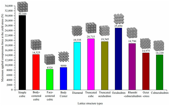 FEA results are shown in Figure 10. The top four types of lattice structures with excellent performance under the axial compression condition were simple cubic, octahedron, truncated cube, and truncated octahedron.