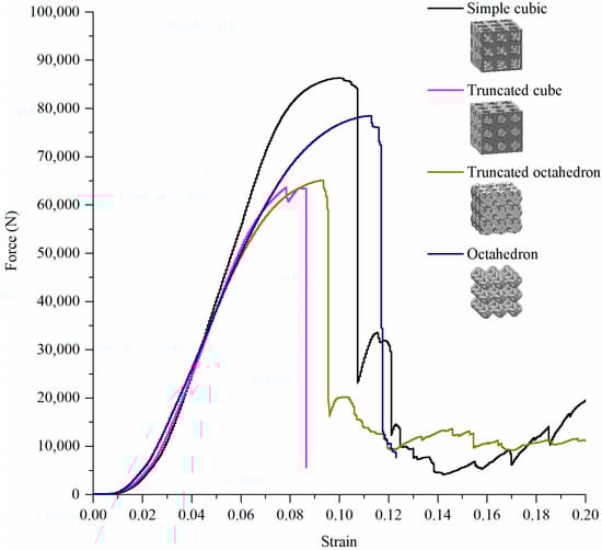 Force–strain response of lattice structures at a relative density of 0.3 and for the 3 × 3 × 3 pattern (simple cubic, truncated cube, truncated octahedron, and octahedron).