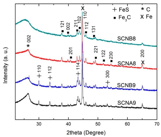 Figure 1 compares the XRD patterns of the synthesized S-CNH samples. In all samples, the diffraction patterns showed evidence of graphitic structure (002) at 2θ = 26.3° with an interplanar distance d = 0.338 nm [35,36,37]. Also, the peaks corresponding to Fe3C were identified with planes (121), (002), (201), (211), (102), (112), (131), (221), (122), and (230). All samples showed a high-intensity peak at 2θ = 44.7° and a second characteristic peak at 2θ = 65.05° (marked by X), which corresponds to metallic Fe that remained encapsulated in the core of the carbon nanostructures due to their growth mechanisms [38]. Finally, samples SCNA9 and SCNB9 display peaks for FeS at 2θ = 29.9°, 33.7°, 43.1°, 53.1°, corresponding to the crystalline planes (110), (112), (114), and (300), respectively. The presence of FeS in these samples is attributed to the high temperature (900 °C), which favors its formation [39].