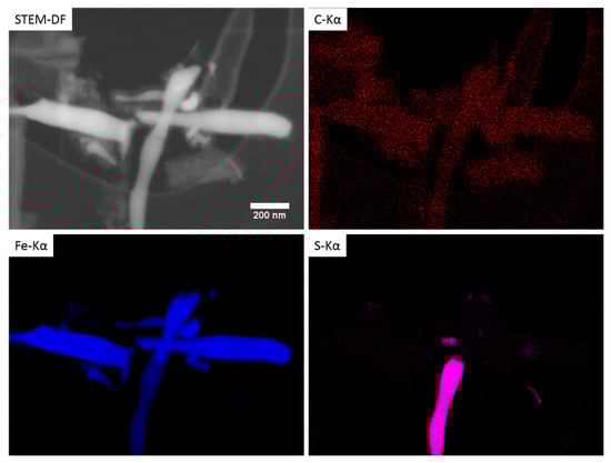 Hollow tubular structures were observed from the dark-field scanning transmission electron microscopy (STEM-DF) obtained with E0 = 30 kV (Figure 2d, Figures S1f and S3f in the Supplementary Materials). Rod-shaped metallic nanoparticles with high atomic number contrast were also observed inside the tubular structure in Figure 2d which might be iron-based seeds from the growth process. The nanoparticles observed in Figure 2c were also noticed in the STEM-DF micrograph (Figure 2d) with the same size but their distribution looked more uniform in the outer layer.