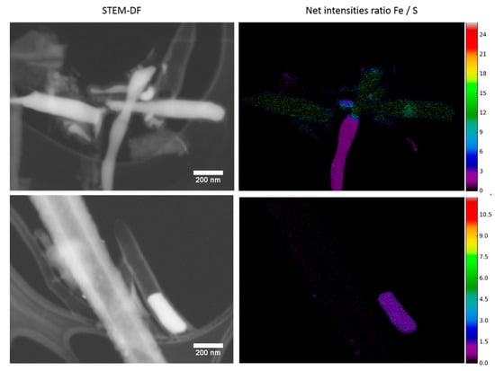 STEM-DF images (left side) and net intensities Fe/S ratio maps (right side) of the SCNA8 (top) and SCNA9 (bottom) samples at E0 = 20 kV.