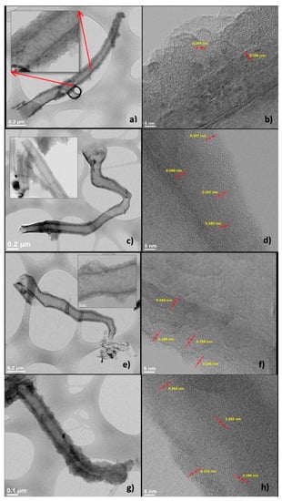 In addition, layers formed on the S-CNH external walls (ordered and amorphous) are also noticed. This behavior could be attributed to the insertion of sulfur in the structure. In the images obtained at higher magnification (Figure 5b,d,f,h), the atomic layers (lattice fringes) are evident. The lattice distances were measured in different areas of the samples. However, it was not possible to identify any clear tendency; the ordered layers (close to the core of the S-CNH), as well as the disordered layers (on top of the ordered ones), showed a mixture of lattice distances mostly of two groups, 0.355 ± 0.001 nm, and 0.296 ± 0.002 nm. Different authors have reported that the interplanar distance for graphite is in the range of 0.335 nm to 0.340 nm [40,41]. According to the XRD analysis, the first group of lattice distances is associated with modified graphite planes, possibly due to the incorporation of S. While the second group is attributed to the formation of an iron sulfide phase [42], which is in agreement with the FeS nanoparticles observed by microscopy.