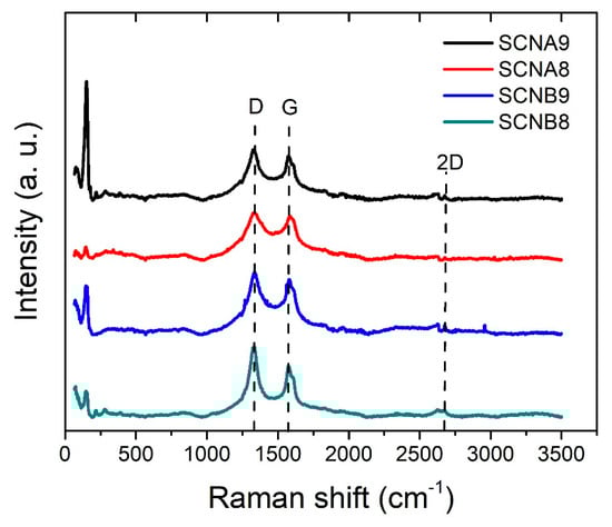 The Raman spectra presented in Figure 6, show intensities that are associated with the D band (1300 cm−1) and G band (1600 cm−1). The width of the bands, present in all samples, is significantly greater than the width that is found in polycrystalline graphite [43]. Hence, the increment in the width of the peak can be attributed to the curvature of the multilayers. Moreover, the 2D band is extremely weak; a low intensity of this band was observed in MWCNT [44]. The D band is indicative of defects in the carbon layers and the intensity ratio (ID/IG) between the D and G bands provides information about the number of defects. The calculated ratio ID/IG is 1.37 ˃ 1.16 ˃ 1.15 ˃ 1.05 for samples SCNB8, SCNA9, SCNA8, and SCNB9, respectively. A large number of defects in all of the samples may be due to the presence of sulfur in the carbon atomic lattice; also, the sulfur incorporation in the carbon network leads to a structural modification that can induce an additional band near the G band. However, there may be a slight influence of the synthesis temperature and flow rate of carrier gas on the graphitization degree. Lower synthesis temperature and low gas flow rate promote the formation of lattice defects. Finally, the Raman spectra show a group of very intense bands between 100 and 200 cm−1, they are mainly attributed to the radial breathing mode (RBM) associated with the inner tube’s small diameter when a suitable resonance condition is established [45]. Hence, the Raman results obtained in this band range could be attributed to the narrower part of the horns where there are a few carbon layers and small diameters, observed in the HRTEM images.