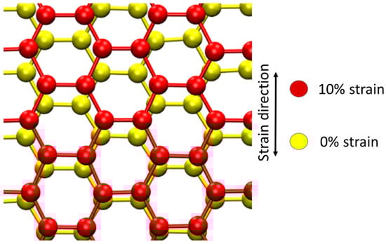 Schematics of graphite cells with and without 10% strain. The arrow points to the stretching direction.