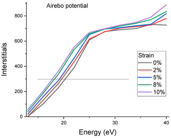 Figure 2 plots the interstitial numbers as a function of carbon knock-on energies. The energies were internationally low to create Frenkel pairs instead of damage cascades. The energy was incrementally changed from 10 eV to 60 eV, in steps of 3 eV. The defect numbers first increase rapidly with increasing energies and then approach a plateau region, followed by a quick rise at higher energies. The curve follows the expectation from the Kinchin–Pease Model [30]: the defect creation efficiency was one at energies of and was 0 for . However, the curve deviates from a rigid step-like profile because (1) the threshold displacement energies are directionally dependent and the varying Ed values shift the profile, leading to gradually rising fronts; (2) thermal vibration also contributes to a similar shifting effect. The total carbon knock-on numberis 1000, but the height of the plateau region is about 700, suggesting that about 30% of the defects are recombined. The defect creation is reduced to zero at the minimum . However, the average is more meaningful in predicting defect creation. Figure 2 shows a clear stress effect in which the defect creation curves appear to shift to lower knock-on energies due to the reduction in the threshold displacement energies under stress. The line in Figure 2 refers to the half-height of the plateau region and is used to measure the . For 0%, the is measured to be 20.3 eV. The values decrease with increasing stress consistently. For 10% strain, the decreases to 17.8 eV.