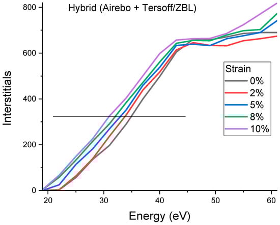 The AIREBO potential was introduced to increase the accuracy in describing long-range interactions [25]. For short-range interactions that are important to collisions, the Tersoff potential linked with the Ziegler–Biersack–Littmark (ZBL) potential at a short distance may be more appropriate [29]. For comparison, the modeling was repeated using a hybrid AIREBO + Tersoff/ZBL potential. Figure 3 plots the modeled defect creations as a function of knock-on energies using the hybrid potential. The overall curve shifting under different stress is similar to that obtained using the AIREBO potential, except the starting at 0% strain is much higher. The hybrid potential obtains 35 eV, which is in good agreement with previous studies (34 to 35 eV was reported in references [22]).