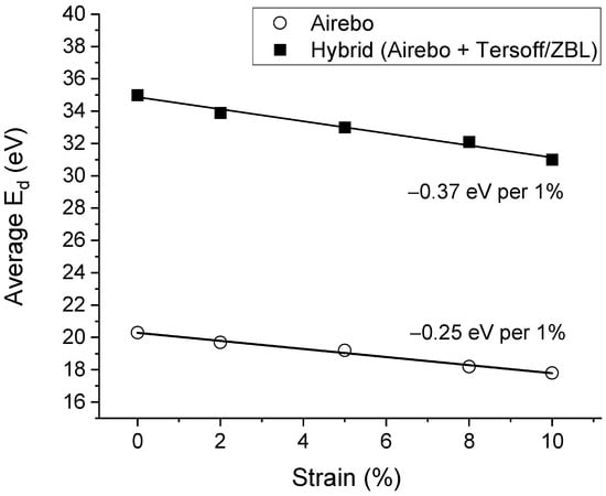 where is the tensile strain, is the threshold displacement energy at zero strain, and is the slope of the vs. strain curve, which is 0.37 eV per 1% strain from the hybrid potential.