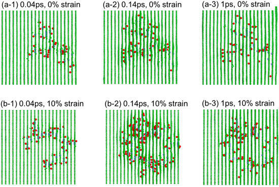 The strain impacted both defect creation and damage cascade evolution. The latter was simulated using higher knock-on energies. Figure 5a,b shows the damage cascade evolution at the times of 0.04 ps, 0.14 ps, and 1 ps, for 0% strain, and 10% strain, respectively. The red color refers to the carbon interstitials. The green color refers to the lattice atoms. The cell is viewed along the basal planes to highlight the interstitials. The basal planes hide the appearance of C vacancies (purple color). The time of 0.14 ps corresponds to the time creating the maximum displacements for 10% strain. At a longer time of 1 ps, the defect numbers decrease due to defect recombination. The number of surviving defects, although reduce s at a longer time, is higher in the stressed cell.