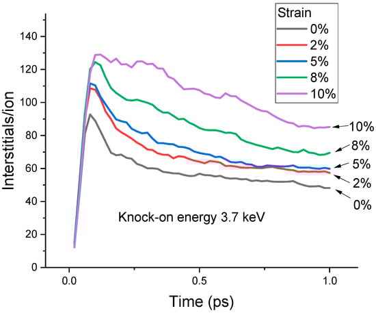 Interstitial numbers as a function of time for different strains. The knock-on energy is 3.7 keV.