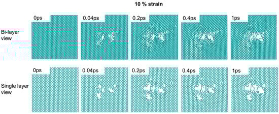 Damage cascade evolution in 10% strained graphite, viewed as a bi-layer and as a single layer. The carbon knock-on energy is 3.7 keV.