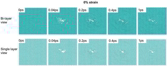 The strain effect is not limited to point defect creation. The structural evolution under stress is also very different. Figure 7 shows the damage cascade evolution for a 10% strained sample, viewed either as a bi-layer or a single layer. The bi-layer view exaggerates the graphene cleavage around the damage cascade core. The cleavage leads to graphene plane gliding and different graphene packing. As shown by the bi-layer view, at 1 ps, regions around the cascade core have A-A packing while the other regions still exhibit A-B packing. The graphene plane develops cracking and local cleavage at the pore edge. In the single-layer view, a large cavity forms, with the edge decorated with a short chain-like one-dimensional segment. There is no noticeable defect recombination at the cavity. The cavity size increases with time. In comparison, Figure 8 shows both the bi-layer view and single-layer view of 0% strained graphite. In comparison to 10% strain, the cavity size is smaller, and there is no graphene gliding observed. The single-layer view shows that the cavity reduces its size from 0.04 ps to 0.2 ps. Overall, the 0% strain sample shows a certain capability of interstitial-vacancy recombination. The defect repair becomes much more difficult under 10% strain.