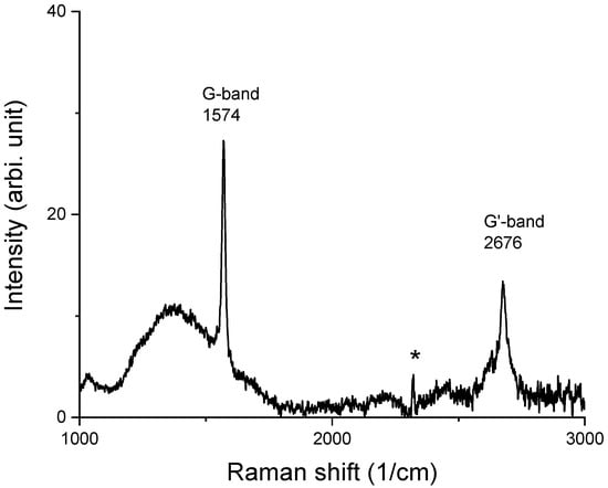 The experimental studies included the steps of folding HOPG, irradiation on the folded edge, and Raman characterization. Figure 9 shows one typical Raman spectrum collected from unirradiated HOPG. The spectrum is featured with a G band at 1574 cm−1 and a G’ band at 2676 cm−1. The spectrum does not exhibit any sharp D band. Instead, there is a bump-like wide band centered around 1370 cm−1. Such a diffusive band is most likely caused by the existence of local amorphous zones from small cracks. As is shown, the D band from the irradiation-induced defects is distinctive. The peak labeled with “*” was previously reported to be due to N2 gas in the air [11]. The G mode is a doubly degenerate phonon mode at the BZ center and is characteristic of sp2 carbon networks. The G’ mode is also called the 2D or D* mode [11]. The mode is symmetry-allowed and appears in disorder-free crystalline graphite. The G’ mode is sensitive to the stacking order of the graphene along the c axis of graphite. Both the D and G’ bands originate from a double resonance Raman process. However, different from the D mode, the G’ mode contains no information on the crystalline sizes and defective levels on graphene planes. Therefore, the G’ mode was not analyzed in the present study.