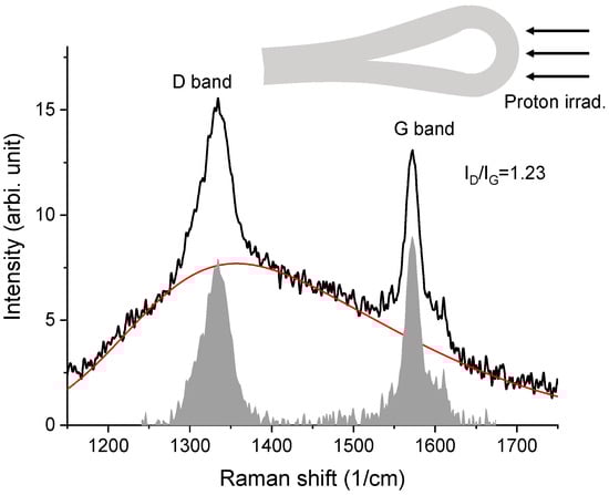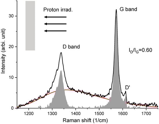 Raman spectrum from irradiated HOPG that was pasted on a flat surface (stress-free). The red line refers to the background used to extract D and G band intensities. The gray box represents the graphite substrate under irradiation. The arrows refer to the proton ion beam.