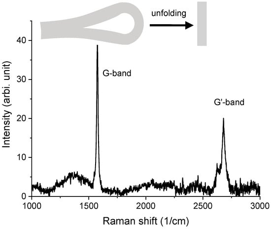 The data in Figure 12 were collected from the HOPG that was folded and then unfolded. No irradiation was performed. The spectrum shows no D band ( = 0). Compared to Figure 9 (virgin HOPG), Figure 12 shows that the Raman response of the folded → unfolded sample is similar to the virgin sample. In other words, there were no D band-related defects introduced by folding. This further suggests that the D band appearance in Figure 10 and Figure 11 was not caused by folding. Hence, is a valid indicator of radiation-introduced damage.