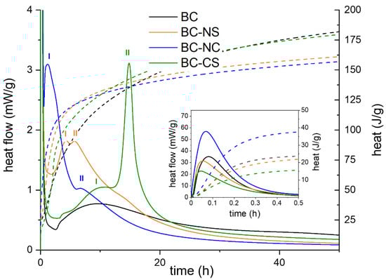 In the initial period in the first minutes after mixing with water, the most important processes are the wetting of cement grains and a rapid movement of ions from their surface into the solution [16]. A significant amount of heat is released, especially due to the congruent dissolution of C3S, while the β-C2S hydration process is considerably slower [16,17]. However, the heat flows for individual samples differ significantly in this region. The presence of sulfates plays an important role in this case. In the absence of gypsum (sample BC), C3A reacts quickly with water, resulting in the formation of hexagonal calcium aluminates hydrates such as C4AH19, C4AH13, and C2AH8, associated with a high release of heat [18,19,20]. On the other hand, the addition of gypsum (sample BC-CS) promotes the precipitation of ettringite, but the reaction with aluminate phases is quite short and directly followed by a deceleration [21]. This substantial slowdown was previously attributed to surface coating by ettringite [22,23]. However, the current research explains the retardation mechanism via the adsorption of sulfate ions on the active sites of C3A [17,24]. Regardless of the aforementioned suggested mechanisms, the total heat evolution during the initial hydration period of the gypsum-containing sample was significantly lower. Based on these findings, a similar course for the initial period can be expected when gypsum is replaced by Na2SO4 (NS) with a same molar concentration of SO42− ions. However, the total heat flow in this period was almost the same as in the system without any admixtures. The obtained results suggest that the sole presence of sulfate ions is not a dominant factor in controlling the kinetics of aluminate phase hydration. This phenomenon was also confirmed by previous studies [23,25], explaining that only the coexistence of calcium and sulfate ions plays a critical role in the retardation of C3A hydration. Nevertheless, the highest amount of heat evolution was observed in Na2CO3 (NC) activation in the first 30 min. The main reason for such an increase in heat flow is predominantly related to the dissolution of Na2CO3. The dissolution process is highly exothermic in the case of Na2CO3 (ΔHdiss = −26.7 kJmol−1) in comparison to CaSO4·2H2O (CS) (ΔHdiss = 0.6 kJmol−1) or Na2SO4 (ΔHdiss = 1.5 kJmol−1) at 25 °C, with respect to the molality of the resulting solutions [26,27].