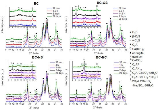The course of the development of the relevant phases in the case of BC-CS was influenced by the addition of CaSO4. Together with the aluminate phases, gypsum participates in the sequence of reactions, where, due to the presence of SO42− groups, the aluminate grains are covered with Aft [32]. The maximum amount of the Aft (alumina, ferric oxide, tri-sulfate) phase was observed after 48 h of hydration. A further decrease is connected to the transformation of AFt into AFm (alumina, ferric oxide, mono-sulfate) and to the formation of the relevant aluminous phase (C4AH13). Nevertheless, even after 28 days of hydration, there was still a noticeable amount of ettringite present in the sample, which may suggest a higher degree of hydration [33]. The coexistence of AFt, AFm and C4AH13 was noticed along with total elimination of C4AF and C3A.