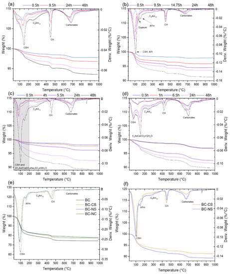 At 48h of hydration time, the dTG diagram becomes almost identical to the BC-CS sample; see Figure 3f. This is in agreement with the XRD diffractogram of the BC-NS samples, which shows a large amount of formed analogue to ettringite with a formula of 2C3A·2CaSO4·Na2SO4·30H2O. This causes the shift of the low temperature in the dTG peak to 100 °C, similar to the ettringite-containing sample. After 28 days, according to XRD measurement, the amount of 2C3A·2CaSO4·Na2SO4·30H2O decreases and ettringite appears. However, due to their similar decomposition temperatures and the resulting overlap of their respective dTG peaks, it was not possible to obtain any quantitative information on their respective content in the BC-NS sample.