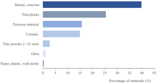 In 2018, China produced 2360 million tonnes of C&DW. The EU generated a significant amount the same year: for example, Germany alone contributed 225 million tonnes [3]. China is the largest producer of C&DW, followed by India and the United States. To date, the main use of C&DW is to replace natural aggregates to produce mortar and concrete. Nevertheless, large-scale C&DW reuse towards a circular economy system needs to be enhanced [4].