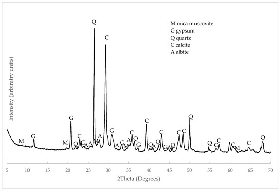 The XRD pattern of C&DW appears in Figure 6. The main peaks corresponded to the presence of quartz (Q, SiO2, PDFcard 210816) and calcite (C, CaCO3, PDFcard 050583). Gypsum was identified as the secondary peak (G, CaSO4·2H2O, PDFcard 210816). These minerals derived from the composition of mortars and concretes (Portland cement and aggregates). Some peaks derived from the ceramic compounds present in C&DW, such as albite (A, NaAlSi3O8, PDFcard 090466) and muscovite mica (M, MgAlSi4O10(OH)2, PDFcard 210993). The presence of these crystalline compounds was similar to the C&DW studied by other authors [19,20].