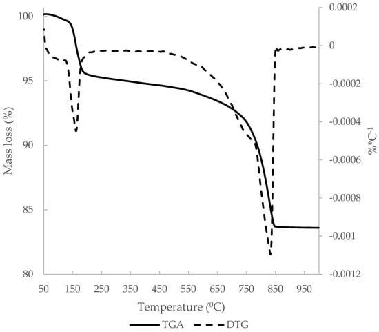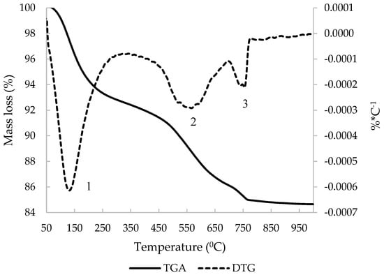 The derivative thermogravimetric curve (DTG) of C&DW is represented in Figure 7. The main peak occurred at around 850 °C, which was attributed to loss of CO2 from CaCO3. The other peak was around 150 °C and was attributed to the dehydration of gypsum and the hydrated compounds that derived from the hydration process of the Portland cement present in the mortar and concrete fractions. Total mass loss was 13.75% and the mass loss that derived from carbonates was 8.07%.