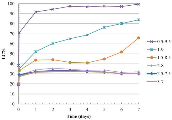 Loss of conductivity (LC%) versus time of the CH/C&DW mixtures.