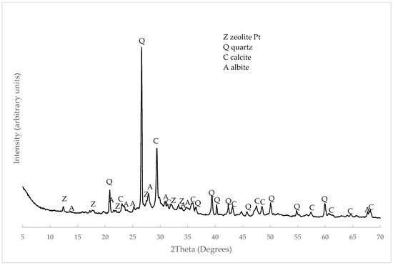 The presence of products derived from the alkali activation reaction was corroborated by the XRD analysis. Figure 11 represents the activated paste and the formation of zeolitic phases, specifically the formation of zeolite Pt (Z, Na5.7Al5.7Si10.3O32·12H2O, PDFcard 340524). The phases of the original material simultaneously appeared, such as albite, quartz or calcite.