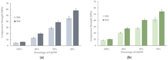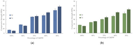 The compressive strength for the C&DW/BFS mortars with different C&DW percentages cured at 65 °C are depicted in Figure 12. The compressive strength was 7.4 MPa after 3 curing days for the mortars activated at the 1.56 SiO2/Na2O molar ratio (Figure 12a) containing 100% C&DW. By replacing only 20% C&DW with BFS, a 201% increment in compressive strength was achieved. A linear increase in compressive strength took place with the rise in BFS and yielded up to 58.2 MPa after 7 curing days at 65 °C for the 50% sample.
