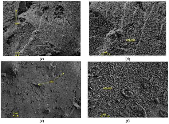 For the BFS-containing pastes (Figure 14c–f), the morphology of the products was more compact than those in the paste with only C&DW. The micrographs reveal particles of unreacted BFS and the principal product of the reaction was C(N)ASH gel. The formation of C(N)ASH gel in the pastes with BFS was reported by Moraes et al. when they activated BFS with sugar cane straw ash [30]. Yang et al. also indicated the presence of this gel while performing an EDS analysis on alkaline-activated BFS and coal gangue samples [31]. In pastes with BFS, the presence of zeolitic phases has not been observed.