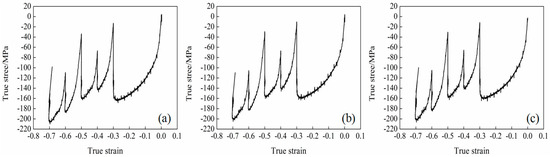 True stress−true strain curves of experimental steel at different final cooling temperatures after five passes of thermal simulation (a) 650 °C; (b) 700 °C; (c) 750 °C.