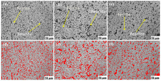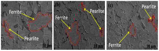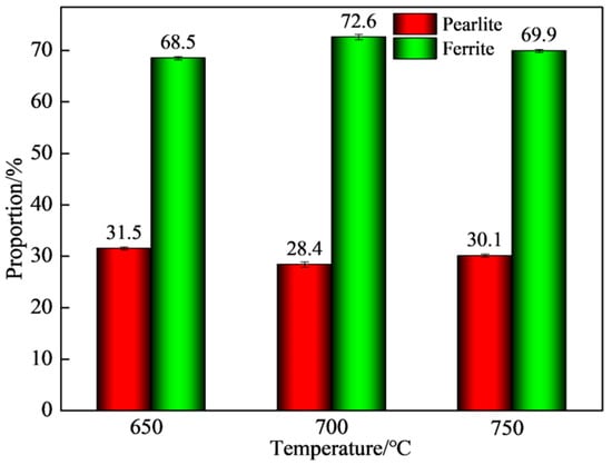 The pearlite structure was processed by Ipwin32 software, and the calculation results are shown in Figure 3d–f. By calculating the same area, Ipwin32 software captured 578 ± 13, 385 ± 15, and 360 ± 10 pearlite particles at 650 °C, 700 °C, and 750 °C, respectively. Then, the area of pearlite (red area) was counted, and the area proportions of pearlite at 650 °C, 700 °C, and 750 °C were 31.5 ± 0.3%, 28.4 ± 0.5%, and 30.1 ± 0.3%, respectively. Figure 4 shows the ratio of ferrite and pearlite in the test steel at different final cooling temperatures.