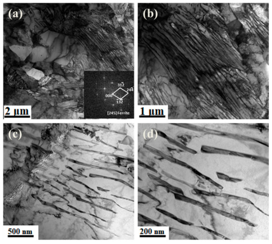 Figure 5 shows the TEM morphology of ferrite and pearlite of the experimental steel at a final cooling temperature of 650 °C: Figure 5a morphology of ferrite and pearlite, Figure 5b–d enlarged figure. Figure 5 shows the dislocation distribution on the ferrite and pearlite matrix of the experimental steel at 650 °C.