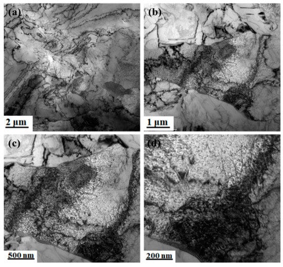 It can be seen from Figure 5 that the ferrite of the body-centered cubic structure was polygonal, the pearlite was distributed on the ferrite matrix, and the pearlite lamellae were relatively clear and arranged in an orderly manner. Figure 6 shows that a large number of dislocations were distributed on the ferrite matrix and grain boundaries of the experimental steel, and a large number of dislocations appeared between the pearlite lamellae. Owing to the recrystallization and non-recrystallization of deformed austenite and the effect of microalloying elements (Nb/V/Ti) after five passes of hot rolling, the grain boundaries increased and a large number of dislocations were produced.