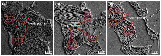 Figure 9 shows that the morphology of pseudo pearlite formed in the experimental steel at different final cooling temperatures (650 °C, 700 °C, and 750 °C) is the same, has an irregular short rod or granular shape, and is disorderly distributed on the ferrite matrix. The reason is that the cooling rate of the center and edge of the steel varied under different final cooling temperatures, resulting in temperature difference, increase in the degree of undercooling, uneven distribution of carbon atoms in undercooled austenite, and slow diffusion rate. Moreover, transformed ferrite carbon atoms do not easily diffuse and migrate to long distances, pearlite lamellae gradually decrease in number and are far away from eutectoid composition, and pearlite transformation increasingly deviates from the equilibrium eutectoid point. When the transformation temperature was lower than the eutectoid point temperature, cementite cannot easily form continuous flakes. Most cementitious are distributed on the ferrite matrix and have irregular granular or short-rod shapes, forming pseudo pearlite. Relevant studies [23,24,25,26] showed that the formation process of pseudo pearlite in low carbon steel is the degradation process of pearlite, and both occur simultaneously and promote each other.