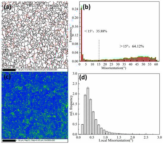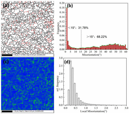 The high-angle grain boundary can effectively inhibit crack propagation and improve the toughness of the material. It can be seen from Figure 10a,b and Figure 11a,b that the large-angle at 650 °C has a higher proportion than that at 750 °C, and the toughness is better. Low-angle grain boundaries are formed during recrystallization and pressure working. Small-angle grain boundaries are mainly distributed in polygonal ferrite crystals and near subgrain boundaries, accounting for 31.78% at 650 °C and 35.88% at 750 °C. Small angles are representative of the dislocation structure, and during the deformation of austenite during roughing and finishing rolling, the phase transformation leads to an increase in the dislocation structure density. Figure 10c,d and Figure 11c,d show the local misorientation distribution results after five passes of rolling. The defect and dislocation density of the samples can be seen. A green color appears around the grain boundaries, with concentrated defects and strains. The deformation first occurs during rolling deformation, resulting in a large number of dislocations around the grain boundaries. The error density was relatively large, which is not conducive to plastic deformation.