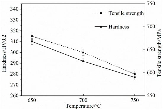 - With the decrease of the final cooling temperature, the tensile strength and hardness gradually increased. When the final cooling temperature is 750 °C, the fracture types were equiaxed dimples and a few shear planes.
